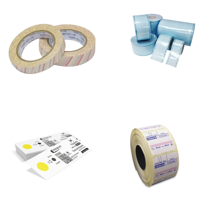 - Indicatorii chimici externi se găsesc în general sub formă de benzi adezive, etichete sau indicatori imprimați pe ambalaje, cum ar fi pungi sau rulouri de hârtie crepate, utilizate pentru a înveli instrumentele medicale înainte de sterilizare.